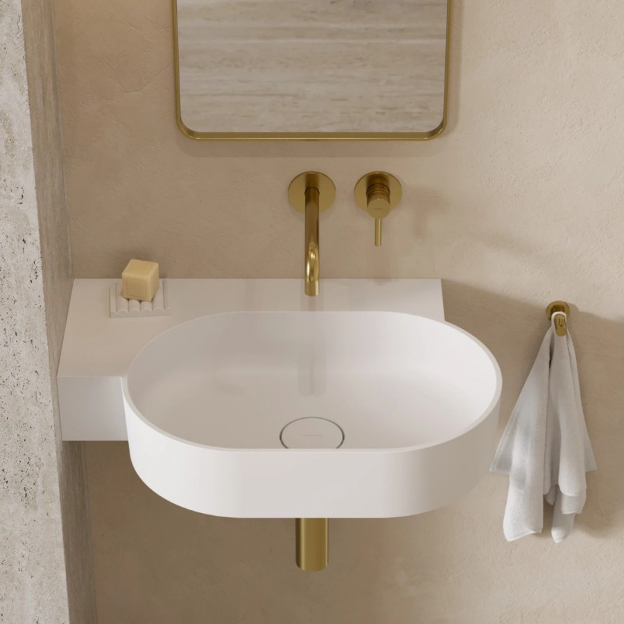 Umywalka z kolekcji OMNIRES OVO charakteryzuje się minimalistyczną, wyrazistą formą o doskonałych proporcjach. Powstały z zabawy geometrią kształt tworzą dwa przeciwległe półokręgi umywalki, połączone z prostokątną, funkcjonalną półką – idealnym miejscem do montażu baterii, a także do odstawienia kosmetyków czy innych niezbędnych akcesoriów. Harmonijnie wyprofilowane ścianki zostały wykończone płaskim, podkreślającym formę rantem, a idealnie dopasowana maskownica odpływu gwarantuje najwyższą estetykę. Od spodu umywalki zaprojektowano dyskretne, fabrycznie podcienione punkty, które wskazują miejsca na wykonanie otworów pod baterię lub dozownik, umożliwiając elastyczne dopasowanie armatury do indywidualnych potrzeb.