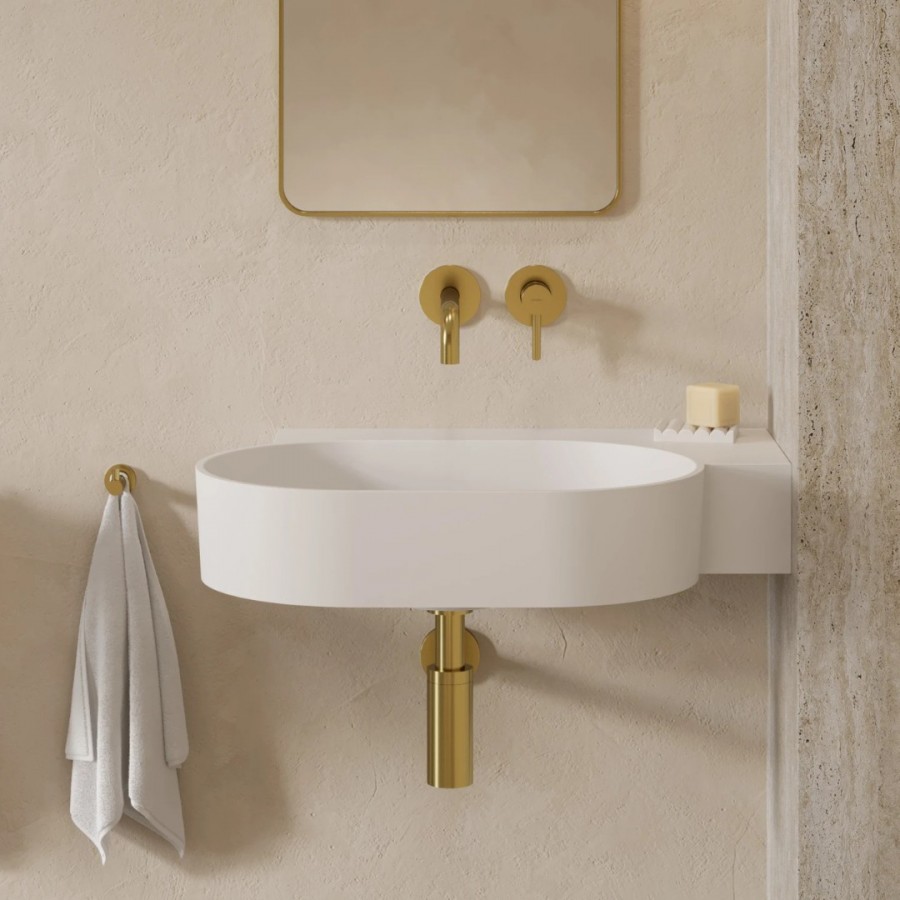 Umywalka z kolekcji OMNIRES OVO charakteryzuje się minimalistyczną, wyrazistą formą o doskonałych proporcjach. Powstały z zabawy geometrią kształt tworzą dwa przeciwległe półokręgi umywalki, połączone z prostokątną, funkcjonalną półką – idealnym miejscem do montażu baterii, a także do odstawienia kosmetyków czy innych niezbędnych akcesoriów. Harmonijnie wyprofilowane ścianki zostały wykończone płaskim, podkreślającym formę rantem, a idealnie dopasowana maskownica odpływu gwarantuje najwyższą estetykę. Od spodu umywalki zaprojektowano dyskretne, fabrycznie podcienione punkty, które wskazują miejsca na wykonanie otworów pod baterię lub dozownik, umożliwiając elastyczne dopasowanie armatury do indywidualnych potrzeb.