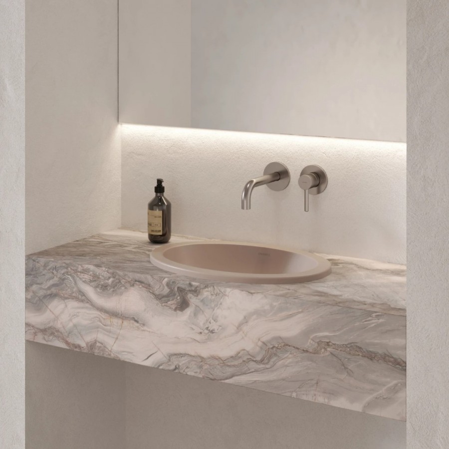 Umywalka podblatowa z kolekcji OMNIRES SHELL M+ charakteryzuje się współczesną eliptyczną formą, która miękką linią zwęża się ku podstawie. Jej kompaktowe wymiary czynią ją idealnym wyborem do małych łazienek i toalet. Precyzyjnie zaprojektowana konstrukcja rantu umożliwia montaż umywalki pod blatem, tworząc jednolitą, spójną powierzchnię. Alternatywnie, umywalkę można zamontować wpuszczając ją w blat, pozostawiając jedynie minimalistyczny rant na powierzchni. Oba rozwiązania montażowe nie tylko ułatwiają codzienną pielęgnację, ale także optymalnie wykorzystują przestrzeń, czyniąc umywalkę idealnym wyborem dla aranżacji, gdzie liczy się każdy detal i maksymalne wykorzystanie dostępnego miejsca.