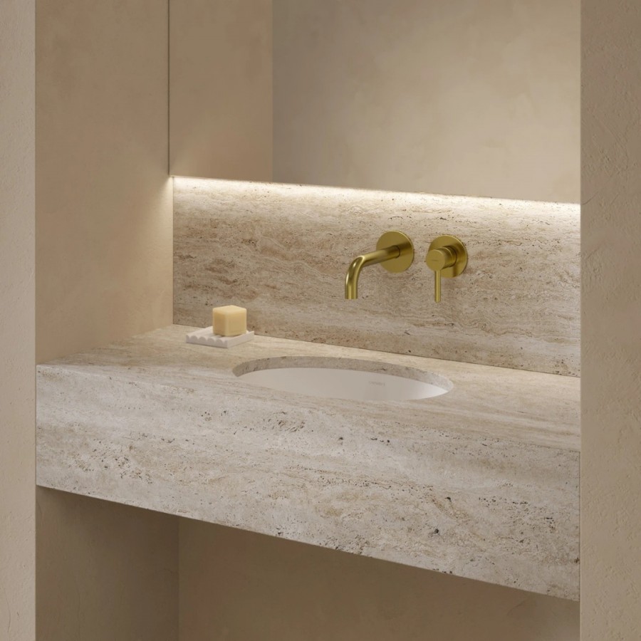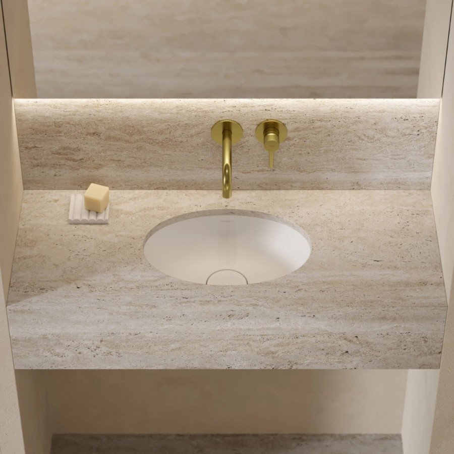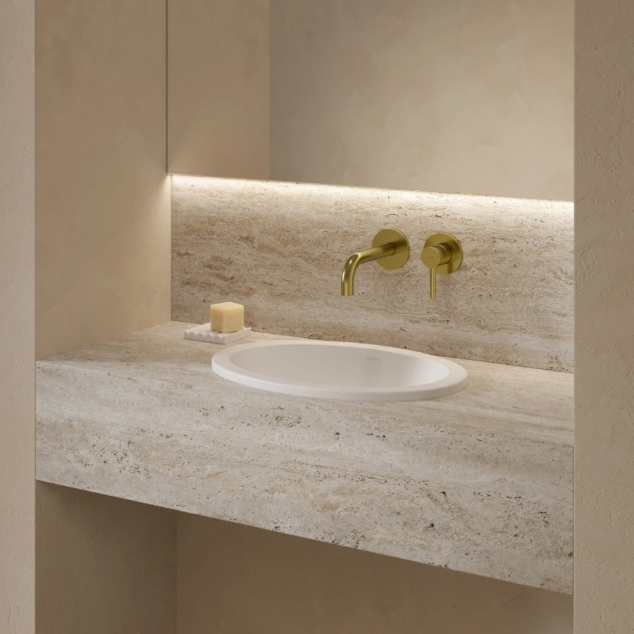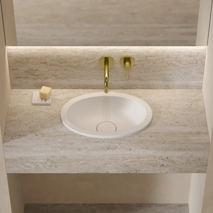 Umywalka podblatowa z kolekcji OMNIRES SHELL M+ charakteryzuje się współczesną eliptyczną formą, która miękką linią zwęża się ku podstawie. Jej kompaktowe wymiary czynią ją idealnym wyborem do małych łazienek i toalet. Precyzyjnie zaprojektowana konstrukcja rantu umożliwia montaż umywalki pod blatem, tworząc jednolitą, spójną powierzchnię. Alternatywnie, umywalkę można zamontować wpuszczając ją w blat, pozostawiając jedynie minimalistyczny rant na powierzchni. Oba rozwiązania montażowe nie tylko ułatwiają codzienną pielęgnację, ale także optymalnie wykorzystują przestrzeń, czyniąc umywalkę idealnym wyborem dla aranżacji, gdzie liczy się każdy detal i maksymalne wykorzystanie dostępnego miejsca.