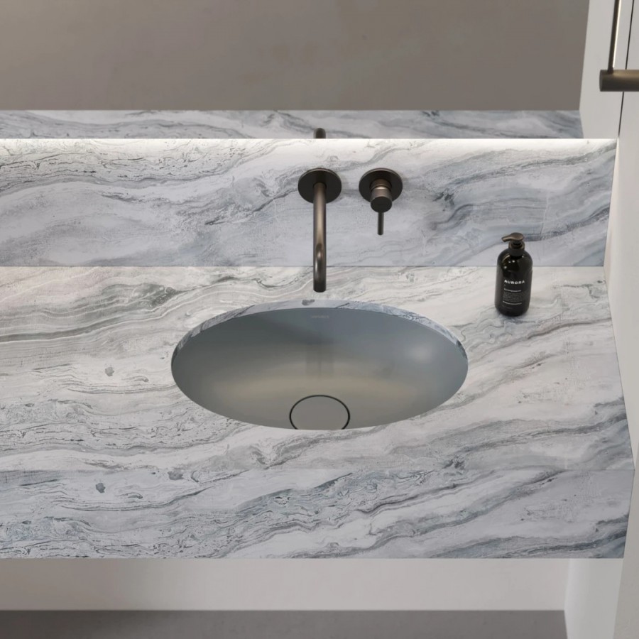 Opis produktu Omnires Shell M+ umywalka 54x37 cm owalna wpuszczana-podblatowa popielaty szary mat SHELL480UPAG