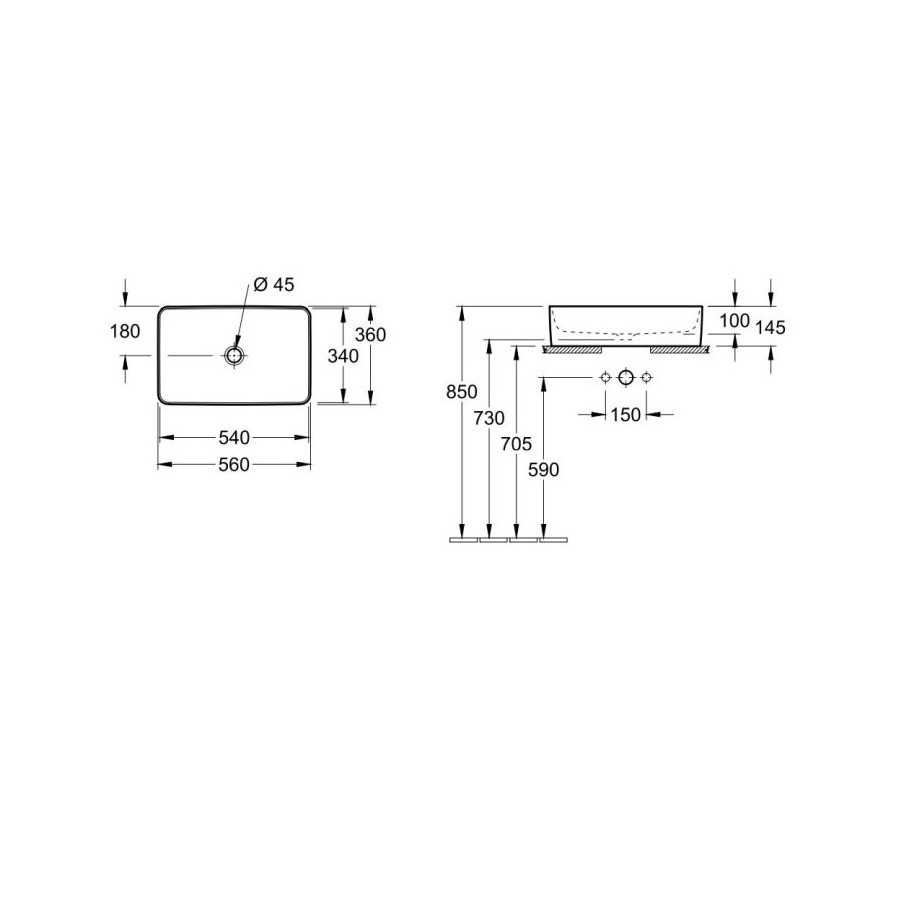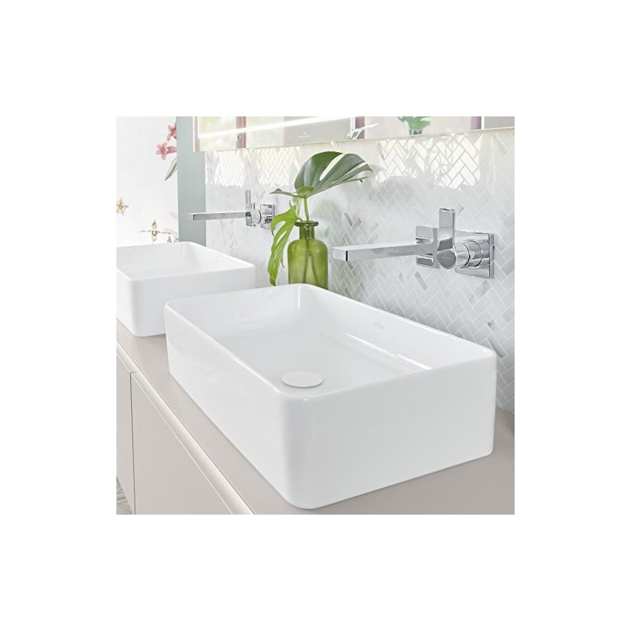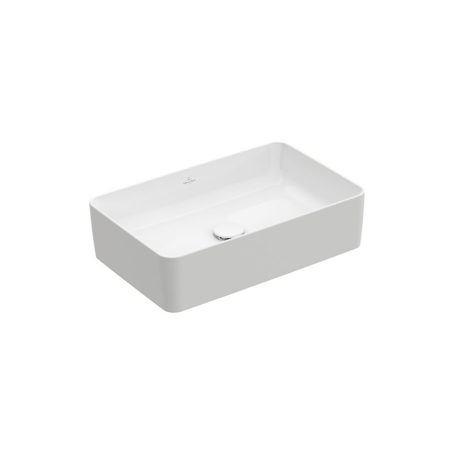 Umywalka nablatowa prostokątne 56x36 cm, bez otworu na baterię, bez przelewu. Wykonana z materiału TitanCeram (mieszanka naturalnych surowców). Umywalka do kompletowania z bateriami ściennymi (długość wylewki min 21 cm) lub wysokimi. W zestawie szablon do wycięcia otworu na blacie.Villeroy&Boch Collaro umywalka nablatowa 56x36 cm 4A205601