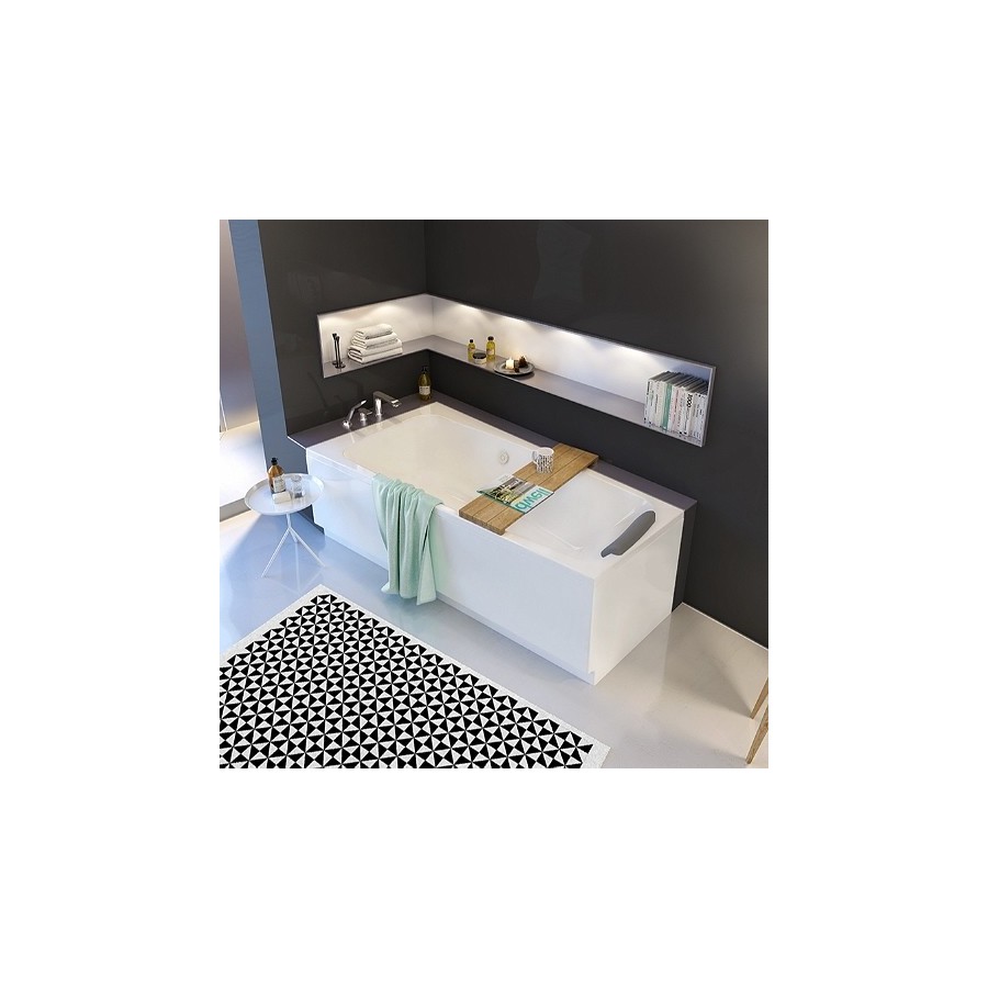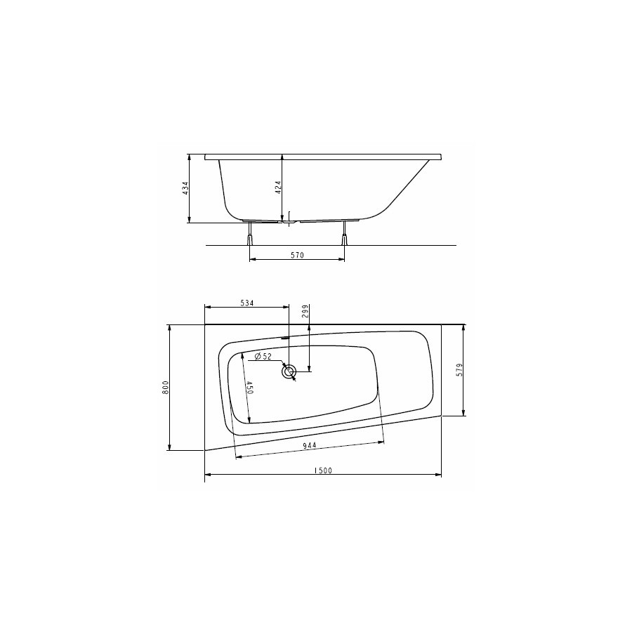 Wanna asymetryczna prawa 150x80x42 cm, szerokość dna: 45 cm. Wykonana z akrylu o pojemności 160 l. W zestawie z nogami montażowymi. Do kompletowania z przelewem wannowym, obudową frontową i boczną.