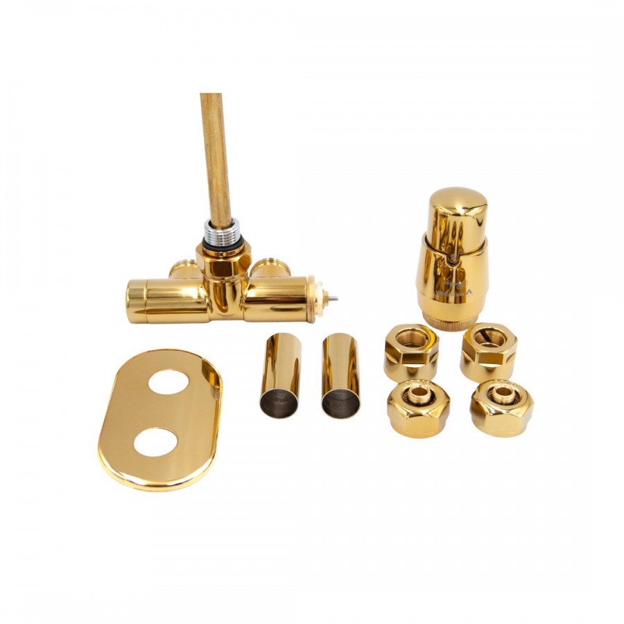 Zestaw do grzejników z pionowymi kolektorami pozwalającymi na zastosowanie grzałki elektrycznej. Rozstaw podłączenia do instalacji 50 mm. GZ ½” / GZ ¾” x GZ ¾”. Kolor: złoty galwaniczny.Zestaw zawiera: